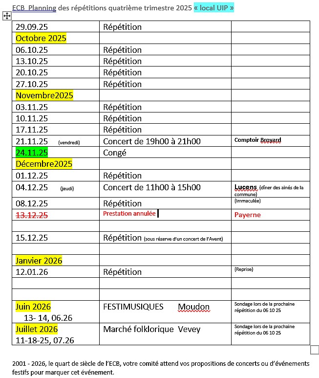 Afin d'obtenir une bonne qualité musicale, l'Ensemble des Cuivres Broyards s'astreint à de nombreuses répétitions durant toute l'année.