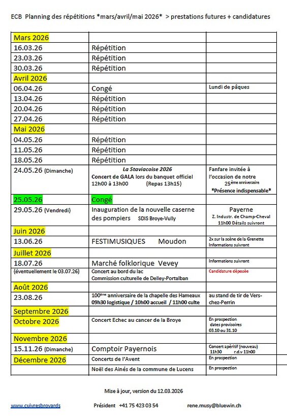 Ci-dessous le tableau des répétitions et prestations de l'ECB - 1er trimestre 2026
