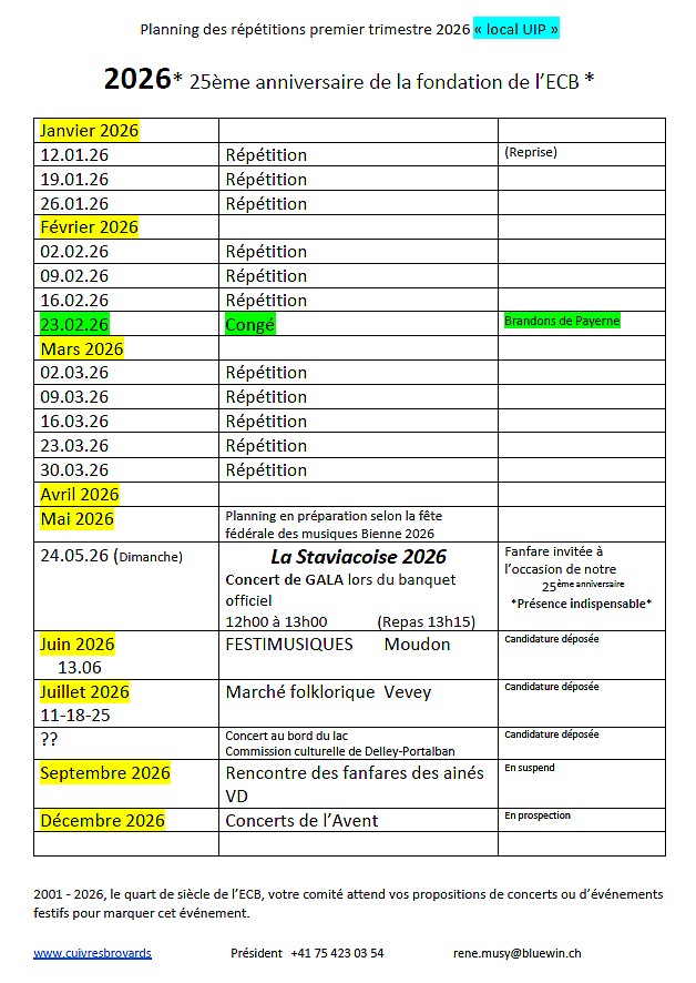 Ci-dessous le tableau des répétitions et prestations de l'ECB - 1er trimestre 2026