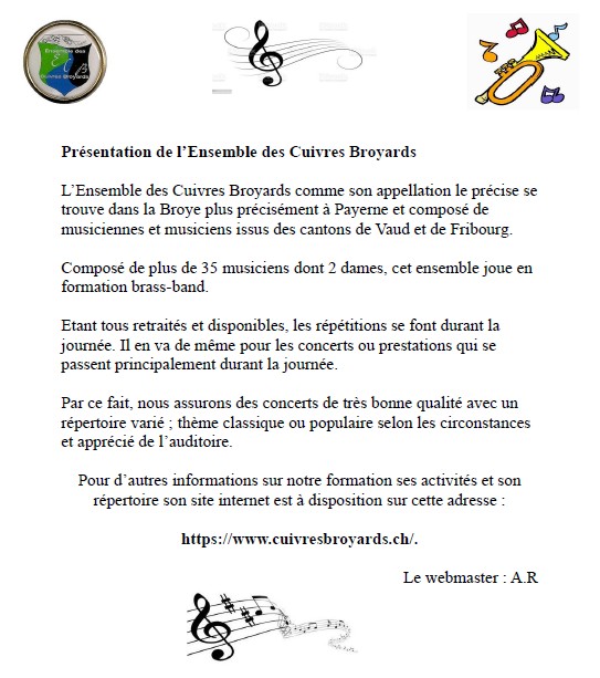 Fondé en 2001, l’Ensemble des Cuivres Broyards de formation brass-band, se compose à ce jour de 37 membres; dont deux dames et d'un directeur talentueux et très compétent.
